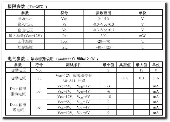 l CMOS工艺制造,低功耗 l 外部元器件少 l RC振荡电阻 l 工作电压范围宽:2.6-15v l 数据最多可达6位 l 地址码最多可达531441种