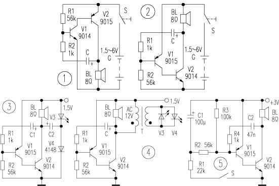 | 选择分类:当前分类——小说笑话 相关联或者相类似的文章: 物理学的前沿--弦理论(10) 引导还是教唆?——某些儿童用品电(9) 五一单片机导购以及光盘大合并!(6) 多频超声波发生器(5) 用AVR单片单片机建立实验应用全过程(4) 新型调频发射芯片MAX2606(4) RegExp正则表达示用法(3) 简单的RS232C电平转换和串口取电(-7) TDA2030A装的18W单声道功放板(-8) USB接口器件PDIUSBD12的接口应用设计(-10) 图示均衡器的使用技巧(-14) 推荐在别站发贴内容的例子!(-18) 二极管的特性与应用 (-20) 一款不易破坏的报警器(-21) Hi-Fi功放设计要点(-34) 盲目试验 损失超百元(-38) 120MHz 2051 频率计 (-42) 光电耦合器的应用(-46) 双声道功率放大器(-46) 看看别人在本站下的订单(-47) 首页 前页 后页 尾页 本站推荐: | 讯响器和LED点亮实验 2003年,第9期,类别:电子技校 1. 电路简介。 图1是讯响器(又称音频振荡器、信号发生器)的典型电路。按图在面包板上连好电路,当电容器C从3.3nF~100μF取不同的值时,扬声器可发出不同的音调响声,将C定在47nF左右,改变R1的值,扬声器的发声音调也可发生变化。注意R1不可太小,一般应大于1kΩ,否则易使V1损坏。如果万用表的两表笔并接在R1的两端,量程选择旋钮放在交直流电压的不同挡位转动,也可使扬声器的发声音调发生变化。将图1的V1和V2换一下位置变成图2电路,也有相同效果。 1、 本站不保证以上观点正确,就算是本站原创作品,本站也不保证内容正确。 2、如果您拥有本文版权,并且不想在本站转载,请书面通知本站立即删除并且向您公开道歉! |