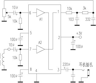 用TDA2822制作音频感应无线耳机《电子报》曾多次刊登。综观各文,发现对TDA2822均没能合理利用。此芯片为双声道音频放大器,而许多制作均只利用了其中一个声道,另一声道闲置;或者做成BTL形式。以上方法虽可行,但从应用上讲没达到最佳效果。此类耳机音源为一多圈磁心线圈,其频响特性类似于录音机磁头,所以应按照RIAA(美国录音工业协会)均衡网络进行频率校正,使其频率响应尽可能平坦。改进后的电路如下图。感应信号首先进入一个声道放大,输出端经过一个衰减网络进行频率校正,最后经电位器馈入另一声道进行功率放大。经此改进后听音,首先是灵敏度增加,有益于掩盖功放的本底噪声;同时声音变得柔和耐听。这对学校进行语言教学非常有利,过高的高频会使人声中唇齿音太明显而影响听音效果。