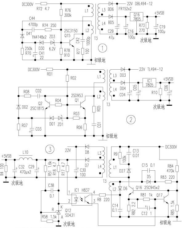 ATX开关电源中,辅助电源电路是维系微机、ATX电源能否正常工作的关键。其一,辅助电源向微机主板电源监控电路输出+5VSB待机电压,其二,向ATX电源内部脉宽调制芯片和推动变压器一次绕组提供+22V左右直流工作电压。只要ATX开关电源接入市电,无论是否启动微机,其他电路可以有待机休闲和受控启动两种控制方式的轮换,而辅助电源电路即处在高频、高压的自激振荡或受控振荡的工作状态,部分电路自身缺乏完善的稳压调控和过流保护,使其成为ATX电源中故障率最高的部位。本文以目前微机中使用的三款国产ATX开关电源为例,根据实物测绘的辅助电源电路,结合检修实例剖析辅助电路的工作原理如下: