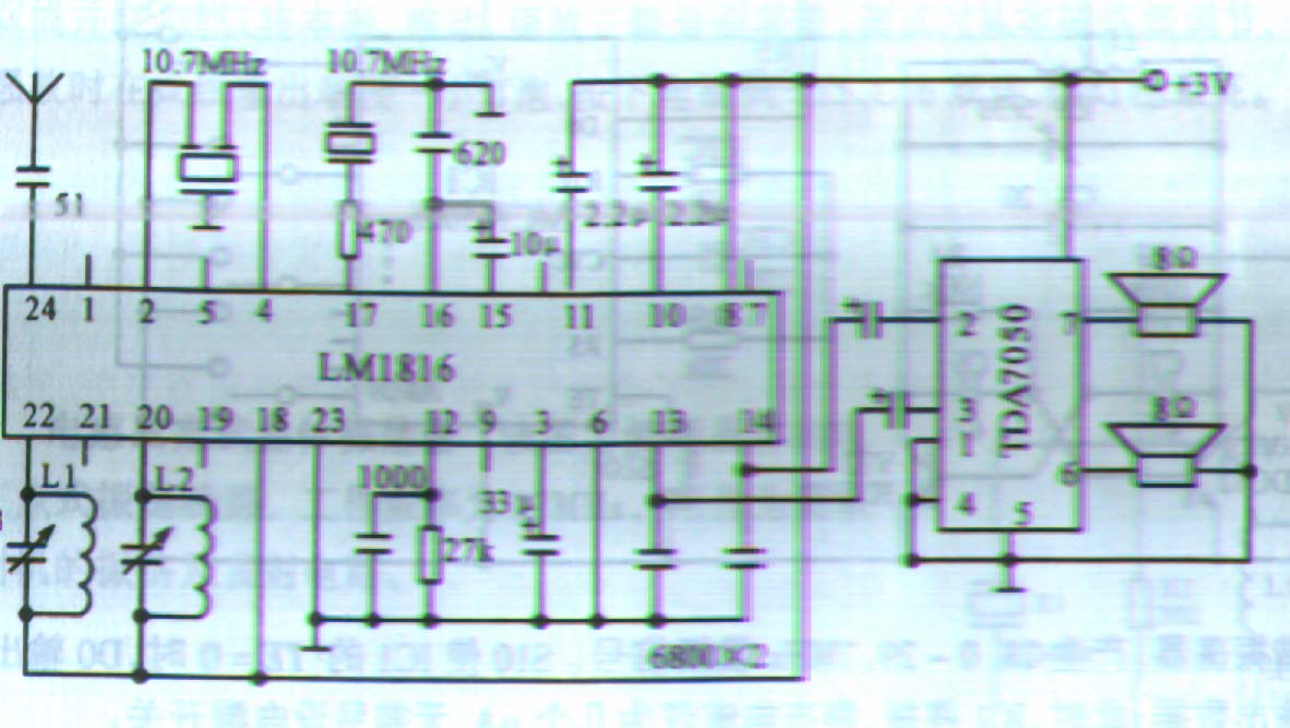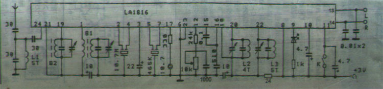 | 选择分类:当前分类——实用电路 相关联或者相类似的文章: EZ编程器自制问答(306) 蝙蝠牌电蚊拍故障检修(304) 请教这个残局有解么(303) 改进TOP222P开关电源模块 (300) 自制无源RS232-485转换器 (300) 500型多用表的小改进(299) 用单片机AT89C2051控制的充电器(296) 短信运行商诈骗黑幕! (293) PF-4型电子恒温仪电路及维修(292) 红外感应开关套件(291) 一装响收音机(采用TA7642)(290) 无线鼠标原理 (290) 一款玩具电子琴(289) 电视方格信号发生器(早已经断货)(280) PLC和单片机一体工控板(280) 光耦CRT的简易测试(277) 自制2.1声道多媒体音响系统(262) 湿度传感器的发展趋势(250) ST Flash的管脚定义 (250) 小调频发射器电路 回复 (246) 首页 前页 后页 尾页 本站推荐: | LA1816的应用 LA1816是目前较新型的单片立体声收音电路,它为24脚双列直插封装和双列扁评封装,其电参数一致。它内含AM/FM朝外差接收功能和立体声解码功能,只需少量的外围元件和外接功放即可收听调频立体声节目。下图是LA1816的原理图 B1是AM磁性天线,B2为AM振荡线圈。L2、L3分别为FM高放和振荡线圈,转换K可AM/FM选听的节目,当收听立体声节目时,第9脚为低电平,LED发光指示,调节12脚可变电阻可使左右声道达到平衡。从天线接收到的电台信号经过IC内的高放变频中放检波立体解码处理后,从13、14脚输出立体声音频信号,外接音频功放即可收听。 本IC的电压为1。8--6V,3V时AM静态电流为3MA,FM为8MA,接收灵敏度分别为AM/1MV/M和FM/20UV/M,由于它的灵敏度和选择性都比较好,所以使用小天线即可正常收听。