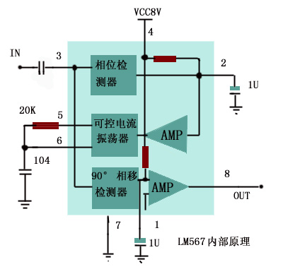 567为通用音调译码器,当输入信号于通带内时提供饱和晶体管对地开关,电路由I与Q检波器构成,由电压控制振荡器驱动振荡器确定译码器中心频率。用外接元件独立设定中心频率带宽和输出延迟。 主要用于振荡、调制、解调、和遥控编、译码电路。如电力线载波通信,对讲机亚音频译码,遥控等。