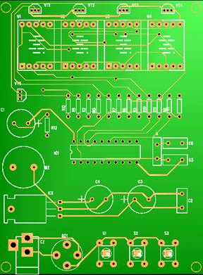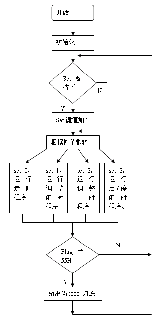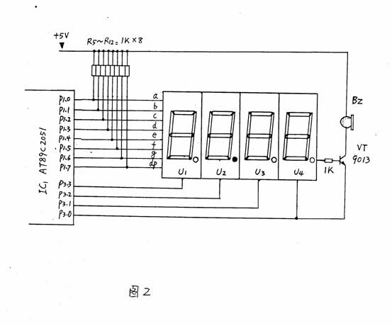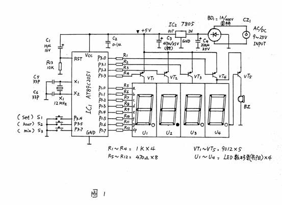 | 选择分类:当前分类——学单片机 相关联或者相类似的文章: 送给单片机爱好者——LED点阵在线编码器(1544) [原创]最新智能色环电阻识别程序(1517) 单片机系统中的汉字显示(1492) 带语音报数功能的抢答器(1489) 五一电子贵宾卡热卖中(1466) 简易音频集成功率放大器(1423) 步进电机驱动(1422) 自制大功率高效逆变模块 (1399) 整流电路详解 (1381) 面试技巧:不是我教你诈(1372) 漂亮MM3(1349) 用VB进行串口实时数据采集(1347) ++ 带限流保护的可调稳压电源 (1331) 本站免费资料的网址(1329) 爱好捕鱼的朋友千万别错过!(我的电鱼机制作经历)(1322) 招学徒,包吃住,免学费,发工资,招工程师(1305) 女孩子不应该学电子?(致女孩)(1302) 智慧的求职:才能和实力都不可少(1297) 测电阻法(1279) 分立电子开关、OTL功放详解(1274) 首页 前页 后页 尾页 本站推荐: | 小小电子闹钟 生活学习良伴 小小电子闹钟 生活学习良伴 ——— 一款电路极简的单片机电子钟设计详解 电路特点 这里介绍的电子钟,电路可称得上极简,它仅使用单片的20引脚单片机完成电子钟的全部功能,而笔者见到的其它设计方案均采用二片以上的多片IC实现。 电路见图1。 ![]() 一片20引脚的单片机AT89C2051为电子钟主体,其显示数据从P1口分时输出,P3.0~3.3则输出对应的位选通信号。由于LED数码管点亮时耗电较大,故使用了四只PNP型晶体管VT1~VT4进行放大。本来笔者还有一种更简的设计方案(见图2),可省去VT1~VT4及R1~R4八个元件,但这种设计由于单片机输出口的灌入电流有限(约20mA),数码管亮度较暗而不向读者介绍,除非你采用了高亮度的发光数码管。 ![]() P3.4、P3.5、3.7外接了三个轻触式按键,这里我们分别命名为:模式设定键set(P3.4)、时调整键hour(P3.5)、分调整键min(P3.7)。C1、R13组成上电复位电路。VT5及蜂鸣器Bz为闹时讯响电路。三端稳压器7805输出的5V电压供整个系统工作。此电子钟可与任何9~20V/100mA的交直流电源适配器配合工作,适应性强。 电子钟功能 1.走时:通过模式设定键set选择为走时,U1、U2显示小时,U3、U4显示分。U2的小数点为秒点,每秒闪烁一次。 2.走时调整:通过模式设定键set选择为走时调整,按下hour键对U1、U2的走时“时”显示进行调整(每0.2秒递加1)。按下min键对U3、U4的走时“分”显示进行调整(每0.2秒递加1)。 3.闹时调整:通过模式设定键set选择为闹时调整,按下hour键对U1、U2的闹时“时”显示进行调整(每0.2秒递加1)。按下min键对U3、U4的闹时“分”显示进行调整(每0.2秒递加1)。 4.闹时启/停设定:通过模式设定键set选择为闹时启/停设定,按下min键U3的小数点点亮,闹时功能启动;按下hour键U3的小数点熄灭,闹时功能关停。 由于电路设计得极其简单,因此丰富的功能只能由软件完成,这里软件设计成为了关键。下面介绍软件设计要点。 图3为主程序状态流程。 ![]() 图3 运行时建立的主要状态标志如下: flag—掉电标志。掉电后,flag内为一随机数;重新设定时间后flag内写入标志数55H。 set—工作模式设定标志。 hour—走时“时”单元。 min—走时“分”单元。 sec—走时“秒”单元。 deda—走时5mS计数单元 t_hour—闹时“时”单元。 t_min—闹时“分”单元。 d_05s—0.5秒位标志。每秒钟的前0.5秒置1,后0.5秒置0,以使秒点闪烁。 o_f—闹时启/停位标志。闹时启动置1,闹时关停置0。 另外将定时器T0设定为5mS的定时中断。这里晶振频率为12MHz,因此5mS的初值为-5000,但实际上程序还要作其它运算,使得时间偏长,经调整为-4800后试验刚好。计时单元deda每次中断均加1。走时函数判断deda>=200时即令秒单元sec加1。同理秒单元sec满60后令分单元min加1。分单元min满60后令时单元hour加1。时单元hour满24后清0。 上电后,首先进行初始化,对各状态标志、输入输出口及定时器T0进行初始化工作,以适应后面程序的要求。 随后程序判断有无set键按下,如按下,则set键值从0起加1。set键值只能从0加到3,然后又回到0。 接下来,根据键值进行散转。若set=0,运行走时程序;若set=1,进入调整闹时时间程序;若set=2,进入调整走时时间程序;若set=3,显示已调好的闹时时间,同时进入启/停闹时程序。 散转完后,进行判断掉电标志flag是否等于55H。若不等,说明刚开机上电或运行过程中掉过电,这时四个数码管以1Hz的频率闪烁四个8字,提示时间不准;若相等,说明未掉电,RAM区内容未变化,时间准确。 再下来程序又转回到初始化之后进行循环运行。 由于使用了四只数码管密集排列,因此只能采用双面印刷板设计,图4、5分别为正面(元件面)、反面的印板图。尺寸3000milx4000mil(7.62cmx10.16cm)。图6为计算机输出的三维仿真印制板。 ![]() 图4 ![]() 图5 ![]() 图6 元件选用 为了走时准确,晶振X最好选用温漂小的。四个数码管U1~U4可选用发绿光的,这样光泽较柔和。蜂鸣器Bz要购买绕线型的电动式蜂鸣器(市场上有一种加电压即工作的蜂鸣器这里不适用),因驱动信号为脉冲信号。其它元件一般无特殊要求。 使用方法 上电后,四个LED数码管闪烁四个8字。 按一下set键,闪烁现象消失(此时set=1),U1的小数点亮,说明此刻可以调整闹时时间。按下hour键,U1、U2作加法;按下min键,U3、U4作加法。这些调整好的数据被同时送入RAM区的闹时记忆“时”单元t_hour和闹时记忆“分”单元t_min。 再按一下set键,set=2,U2的小数点亮,此刻可以调整走时时间。按下hour键,U1、U2作加法;按下min键,U3、U4作加法。这些调整好的数据也被同步
