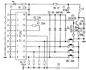 这是一种目前用途非常广泛的200米四键遥控模块,常用于报警器设防、车库门遥控、摩托车、汽车的防盗报警等,这类用途要求遥控器的遥控距离并不远,一般50米足够了,但要求:遥控模块价格低廉,发射机手柄体积小巧、外观精致,耗电尽可能省,工作稳定可靠。