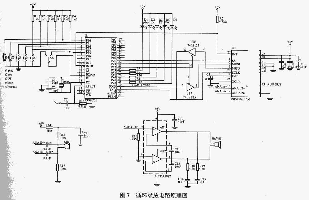 电路原理图如图7所示,整个电路由单片机控制显示电路、ISD4004语音录放电路、话筒输入电路、音频功率放大电路几部分构成。ISD4004的片选信号SS由控制器P2.0提供。单片机AT89C51的串行口工作于同步移位寄存器方式,同步移位脉冲由TXD(P3.1)输出至ISD4004的串行时钟输入端SCLK,数据由RXD(P3.0)输入输出。因AT89C51单片机不具备(SPI)接口,故这里通过三态门将RXD(P3.0)数据线复用。对单片机而言,发射时作为输出,接至ISD4004的串行输入端(MOSI);接收时作为输入,接至ISD4004的串行输出端(MISO)。电路中拔动开关Ks用于选择启用或取消循环录音功能。