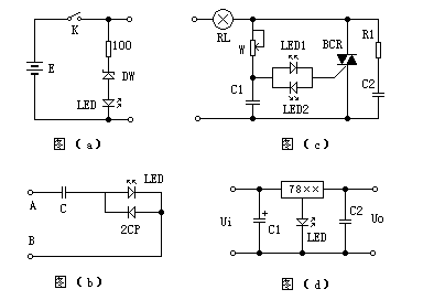图(d)是用在固定输出三端稳压电路中用以提升输出电压。并可兼作电源指示。