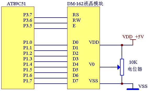 DM-162采用标准的14脚接口,其中VSS为地电源,VDD接5V正电源,V0为液晶显示器对比度调整端,接正电源时对比度最弱,接地电源时对比度最高,对比度过高时会产生“鬼影”,使用时可以通过一个10K的电位器调整对比度。RS为寄存器选择,高电平时选择数据寄存器、低电平时选择指令寄存器。RW为读写信号线,高电平时进行读操作,低电平时进行写操作。当RS和RW共同为低电平时可以写入指令或者显示地址,当RS为低电平RW为高电平时可以读忙信号,当RS为高电平RW为低电平时可以写入数据。E端为使能端,当E端由高电平跳变成低电平时,液晶模块执行命令。D0~D7为8位双向数据线。