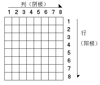 点阵显示模块WTD3088的(红色)列输入线接至内部LED的阴极端,行输入线接至内部LED的阳极端(若阳极端输入为高电平,阴极端输入低电平,则该LED点亮)。发光点的分布如图22-0所示。  Fig 22-0 WTD3088 LED分布 如图22-1示,本实验模块使用74LS374来控制列输入线的电平值。将74LS374的某输出置0,则对应的LED阴极端被置低。如图22-2示,本实验模块使用74LS273来控制行输入线,并通过9013提供电流驱动。将74LS273的某输出置1,则对应的LED阳极端被置高。每次系统重新开启或总清后,74LS273输出为全0,LED显示被关闭。