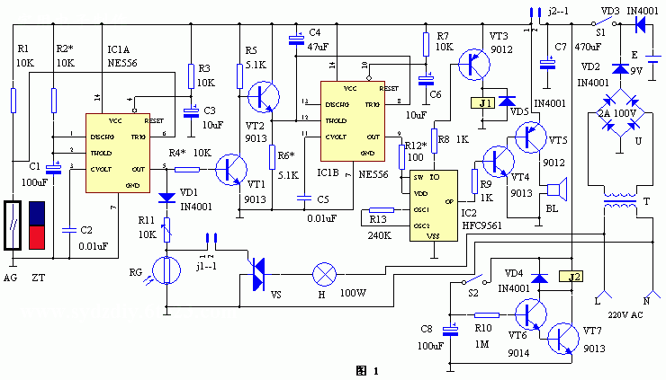 该装置电路工作原理见图1(点击下载原理图)。它是由触发装置、单稳态延时电路、报警声发生器、音频功放电路、灯光控制电路、预置封锁电路和电源电路等部分组成。当房门锁上时,永久磁铁ZT和常闭型干簧管AG靠得很近,ZT的磁力线导致AG内两触片分离,于是IC1A的⑥脚呈高电平,IC1A处于复位状态,其输出端⑤脚为低电平,双向可控硅VS无触发电流而阻断,故照明灯H处于熄灭状态。此时三极管VT1亦无偏压而截止,VT2则导通,使IC1B的12、⑧脚呈高电平(大于2/3电源电压),故IC1B的⑨脚亦输出低电平,音响集成电路IC2无电源不工作。