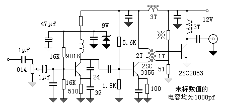 与上图的电路结构完全相同,只是改了几个元件的数值,晶体管也做了调整。由于输出功率较小,用3355做输出也不用考虑输出管的安全问题,可以长期稳定地工作。