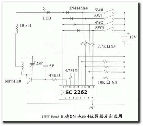 2262每次发射时至少发射4组字码,2272只有在连续两次检测到相同的地址码加数据码才会把数据码中的“1”驱动相应的数据输出端为高电平和驱动VT端同步为高电平。