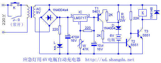市面上出现的6V电瓶供电的应急灯,随机配的充电器过于简单,长时间工作发热严重、易烧毁。充电时还容易造成电瓶过充,引起电解液过早干涸而缩短电瓶寿命。针对这一缺点,笔者将其改成自动充电器,经半年多使用,效果良好,电路如下图所示: