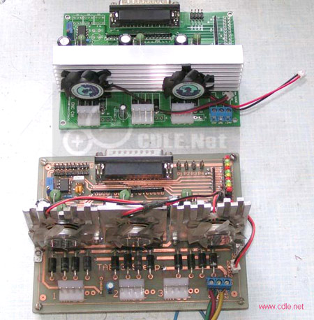 这是SLA7062M和TA8435H的单轴和三轴板子,今天装了一块用单片机调试一下,效果非常好。到底是大功率的片子,将驱动电压加到28V,用1600K的电机试验运行了一会,电机热的烫手,但芯片还只是温热(用TA8435芯片加风扇也烫手,当然其不超过12V还是不错的),看来不超过3A的话,用一般散热片是足够用了。