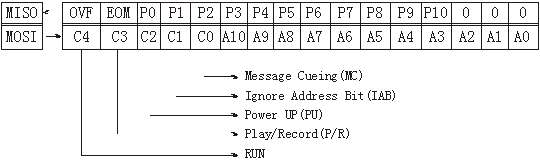 读状态:OVF和EOM | 注:快进只能在放音操作开始时选择。 (三)SPI端口的控制位 (四)SPI 控制寄存器 SPI控制寄存器控制器件的每个功能,如录放、录音、信息检索(快进)、上电/掉电、开始和停止操作、忽略地址指针等。详见下表: