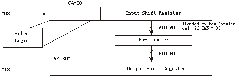 行指针寄存器输出 输入地址寄存器 | 注:IAB置0时,录、放操作从A9-A0地址开始。为了能连贯地录、放到后续的存储空间,在操作到达该行末之前,应发出第二个SPI指令将IAB置1,否则器件在同一地址上反复循环。这个特点对语音提示功能很有用。RAC脚和IAB位可用于信息管理。SPI端口简单框图如下: