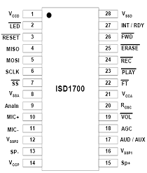 ISD1700 是华邦 ISD 公司 2007 年新推出的单片优质语音录放电路,该芯片 提供多项新功能,包括内置专利的多信息管理系统,新信息提示( vAlert ) , 双运作模式(独立 & 嵌入式),以及可定制的信息操作指示音效。芯片内部 包含有自动增益控制、麦克风前置扩大器、扬声器驱动线路、振荡器与内存等的全方位整合系统功能。 一、 特点: · 可录、放音十万次,存储内容可以断电保留一百年 · 两种控制方式,两种录音输入方式,两种放音输出方式 · 可处理多达 255 段信息 · 有丰富多样的工作状态提示 · 多种采样频率对应多种录放时间 · 音质好,电压范围宽,应用灵活,价廉物美 二、 电特性: · 工作电压: 2.4V-5.5V,, 最高不能超过 6V · 静态电流: 0.5 - 1 μA · 工作电流: 20mA