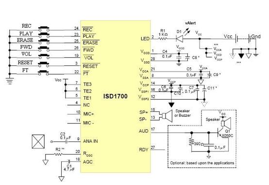 三、独立按键工作模式 ISD1700 的独立按键工作模式录放电路非常简单(后附图),而且功能强大。不仅有录、放功能,还有快进、擦除、音量控制、直通放音和复位等功能。这些功能仅仅通过按键就可完成。 在按键模式工作时,芯片可以通过 LED 管脚给出信号来提示芯片的工作状态,并且伴随有提示音,用户也可自定 4 种提示音效。 录音操作: 按下 REC 键, REC 管脚电平变低后开始录音,直到松开按键使电平拉高或者芯片录满时结束。录音结束后,录音指针自动移向下一个有效地址。而放音指针则指向刚刚录完的那段语音地址。 放音操作 : 放音操作有两种模式,分别是边沿触发和电平触发,都由 PLAY 管脚触发。 A )边沿触发模式: 点按一下 PLAY 键, PLAY 管脚电平变低便开始播放当前段的语音,并在遇到 EOM 标志后自动停止。放音结束后,播放指针停留在刚播放的语音起始地址处,再次点按放音键会重新播放刚才的语音。在放音期间, LED 灯会闪烁直到放音结束时熄灭。如果在放音期间点按放音键会停止放音。 B )电平放音模式: 如果一直按住 PLAY 键,使 PLAY 管脚电平持续为低,那么会将芯片内所有语音信息播放出来,并且循环播放直到松开按键将 PLAY 管脚电平拉高。在放音期间 LED 闪烁。当放音停止,播放指针会停留在当前停止的语音段起始位置。 快进操作: 点按一下 FWD 按钮将 FWD 端拉低,会启动快进操作。快进操作用来将播放指针移向下一段语音信息。当播放指针到达最后一段语音处时,再次快进,指针会返回到第一段语音。当下降沿来到 FWD 端时,快进操作还要决定于芯片当时的状态: 如果芯片在掉电状态并且当前播放指针的位置不在最后一段,那么指针会前进一段,到达下一段语音处 如果芯片在掉电状态并且当前播放指针的位置在最后一段,那么指针会返回到第一段语音处。 如果芯片正在播放一段语音(非最后一段),那么此时放音停止,播放指针前进到下一段,紧接着播放新的语音。 如果芯片正在播放最一段语音,那么此时,放音停止,播放指针返回到第一段语音,紧接着播放第一段语音。擦除操作: