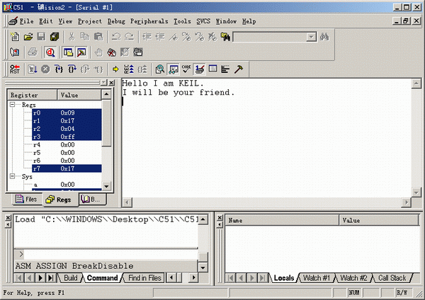 9)调试程序:在上图中,单击“Debug”菜单,在下拉菜单中单击“Go”选项,(或者使用快捷键F5),然后再单击“Debug”菜单,在下拉菜单中单击“Stop Running”选项(或者使用快捷键Esc);再单击“View”菜单,再在下拉菜单中单击“Serial Windows #1”选项,就可以看到程序运行后的结果,其结果如下图所示