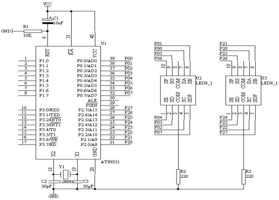 如下图所示,在AT89S51单片机的P0和P2端口分别接有两个共阴数码管,P0口驱动显示秒时间的十位,而P2口驱动显示秒时间的个位。