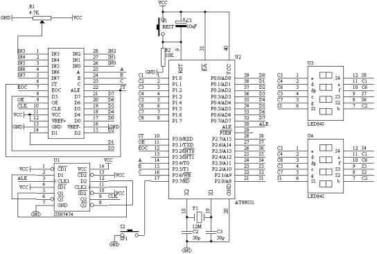 (1).    进行A/D转换时,采用查询EOC的标志信号来检测A/D转换是否完毕,若完毕则把数据通过P0端口读入,经过数据处理之后在数码管上显示。