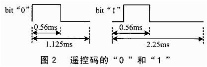 采用脉宽调制的串行码,以脉宽为0.565ms、间隔0.56ms、周期为1.125ms的组合表示二进制的“0”;以脉宽为0.565ms、间隔1.685ms、周期为2.25ms的组合表示二进制的“1”,其波形如图2所示。