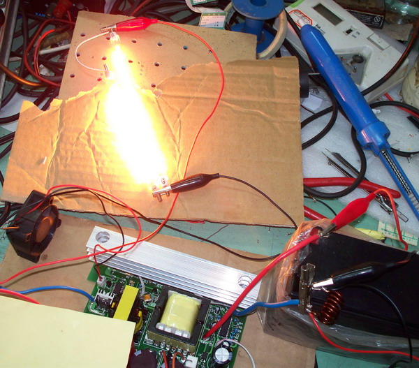 再后来用两个彩电高压包的铁氧体并联,组成口子形,线圈分别绕在两个柱子上,初级1.5,14+14圈,次级480圈.用15D的管子半边12个,这个功率做到了300W.带200W+100W220V灯泡还有200V.效率有75%左右.我用12V32AH的电瓶下河电鱼,间歇工作(电鱼机都是间歇工作的)一天电七八个小时,可以电两天冲一次电.不过我们那里是淡水,水质较好,水也不深.我的机子个人背着很轻松,一个人可以电一天.