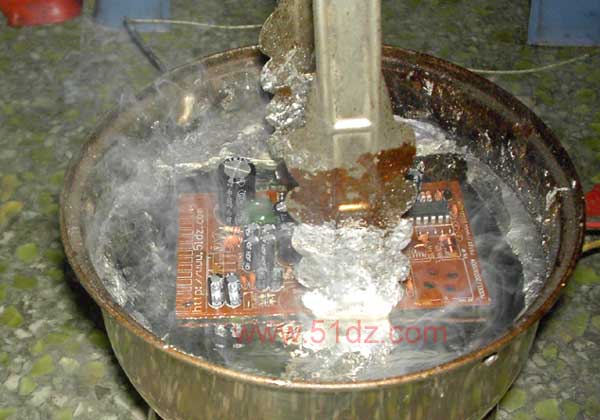 | 选择分类:当前分类——电子入门 相关联或者相类似的文章: 识别色环电阻的阻值...(1141) 应用资料-数字电路IC全系列名称查询表(1136) 电子制作专用微型模块盒子(1132) DS1820测温原理(1129) 七仙女离婚(1127) 电容器的参数与分类(1126) 场效应管工作原理(1125) 面试时要问清楚的几个问题 (1118) 几句代码实现控制摄像头(转)(1117) 了解隔离变压器(1116) STC单片机选型指南(1111) 电烙铁的妙用(1109) 自制PIC单片机编程器(1105) 麻烦的USB硬盘和延长线(电子知识)(1105) 如何学好电子技术(致初学者)[转(1093) 性能可靠的60W石英灯用电子变压器(1091) 小功率充电器的设计(1084) 做梦机的制作(1078) 家长老师必看:《玩,也是学习!》(1076) 热列庆祝本站电子实验套件专利正式授权(1074) 首页 前页 后页 尾页 本站推荐: | 电子线路板的简易加工图片展 如果产品生产的数量较少,大型的电子厂家就不愿意为你生产加工。即使愿意为你加工,你的加工费将因为数量小变得非常非常的昂贵,甚至仅仅加工费就远远超过成品板的价值。 但是,有时又需要生产几十、几百块板,难道你用电烙铁一个一个的焊接?那样成本也会很贵。 有没有一个低成本的方法呢?有,只要有电饭煲就可以了。请看以下组图: 先将电子元件插在电路板上并放好,注意先插小元件,注意压平元件; ![]() 插好的板一定要放在稳妥的地方,防止碰翻元件掉落; ![]() 将焊锡条放入锅中用电炉加热到全部熔化,有条件的可以安装自动温控器,也可以测量温度,温度一般在250-350度之间为宜。 如果条件都没有的话,就只有通过经验来决定了。大家可以看见图中熔化的锡象镜子一样反光,有清晰的倒影。(用干硬纸皮拨开锡面一个空间)。 ![]() 还需要松香水。松香水就是将松香放入酒精中熔解即可。酒精易挥发,注意控制浓度好象是浓茶的样子即可。浓点、淡点问题都不是很大,请根据实际经验定。 ![]() 先用金属的夹子(卖馒头面包的几块钱的就可以用,没必要买专业的)夹住板先浸一个松香水,注意松香水不要打湿电路板正面。 ![]() 再将板放进熔化的锡炉,注意不要紧张,虽然下面有三百度的高温,但你的手在十几个厘米外,非常安全的。 ![]() 先拨开锡面的锡渣,让线路板底面均匀接触锡面,此时有吱吱声和烟雾。将焊接时间控制在2到3秒左右。 ![]() 拿起线路板,看看,效果非常好,接着做下一个吧! ![]() 下图中有一块中有很大的连接,锡陀,这是焊接时间偏短或者锡炉温度低的原因。 ![]() 如果线路烫起泡,则是焊的时间偏长或者锡炉温度高。焊好的板,元件不会掉了,可以乱放。 ![]() 以上动作并不难,很简单,试一下就会了,但是,请大家注意安全,锡炉本身要放在非常稳妥的地方,注意什么东西都不要掉进锡炉(特别是浸板时要注意,防止板掉进锡炉。 声明:本站不对大家的模仿带来的任何损失负责,请小心小心再小心的操作! 参考经验: 选用口径小的锡炉,可以一次投入较少的焊锡(一般要保证有5CM左右或者更深的深度)。否则,可能第一次要放入400元以上的焊锡哟! 锡炉加热和冷却的过程分别需要30分钟到2个小时的时间之久,所以,请提前做好准备。 有条件的可以用自动温度控制器控制锡炉温度。本站有几个转让,去商城特价处理区找看还有没有。 以上图说明,用电炉也可以当作锡炉完成大量的焊接工作。欢迎转载,请常来本站。 1、 本站不保证以上观点正确,就算是本站原创作品,本站也不保证内容正确。 2、如果您拥有本文版权,并且不想在本站转载,请书面通知本站立即删除并且向您公开道歉! |