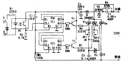 | 选择分类:当前分类——常用资料 相关联或者相类似的文章: 74系列芯片资料 (11661) 怎样安装AT51编程板的USB转串口软件?(8206) 步进电机驱动(1422) 自制大功率高效逆变模块 (1399) 部分万用表电路图集(1197) 应用资料-数字电路IC全系列名称查询表(1136) 场效应管工作原理(1125) 什么是超级电容(1061) 可调型汽车蓄电池充电器 (1031) 全新最简纯绿的绘电路图软件(1008) 标准手机锂电池充电器(978) DC6V可充电应急灯电路(970) DS1302 涓流充电时钟保持芯片的原理与应用(940) 微型停电应急灯电路图里面的二极管(929) 常用运算放大器(929) 鉴别可控硅三个极的方法(926) ++ 高精度电压监视器 ++(917) ++ 555电路速查 ++(909) RS232C接脚与对连线(908) 单片机编码、解码2262(892) 首页 前页 后页 尾页 本站推荐: | 实用单键床头灯调光器 本文介绍这种床头灯调光器只使用一只按键和一片通用集成电路,具有弱光、中光、强光三档光调控制功能,由于采用光电耦合器,安全可靠,非常实用。 1.电路工作原理 该调光控制电路如附图所示。PC是一光电耦合器,PC中光敏管在未收到光照射时处于截止状态,其发射极电位为低,按一下S按钮,PC中发光二极管中有电流流过而发光,光照射到光敏管上时由截止状态变为导通,其发射极电位由低跳变为高,这一正跳变输入IC1的CL1端。IC1、IC2是一片又D触发器,均接成双稳态触发器。将IC1的Q1端接至IC2的CL2端,使IC1、IC2构成了一个二进制计数器,即其输出端Q2、Q1为00、01、10、11二进制数。 ![]() 当电路在接通电源瞬间,由C1、R3产生的微分脉冲作用于IC1、IC2的复位端R1、R2时,Q2、Q1均为“00”,晶体管V1、V2,双向可控硅V3、V4均截止,双向触发二极管V5及双向可控硅V6截止,灯H断电不发光。当按一下S时,IC1的CL1端得一正脉冲作用,IC1翻转,Q1端为高电平(IC2不翻转),计数器为“01”,V1、V3相继导通,220V正半周经V3、RPI向电容C2充电,C2充电触发V5导通,V6亦以某一导通角导通,灯H通电发弱光。若再按一下S,IC1的CL1端又得一正脉冲作用,IC1翻转,Q1为低电平,IC2亦触发翻转,Q2为高电平,计数器为“10”,V2充电,V5导通,V6导通其导通角较V3导通时增大一些,灯H发中等光。若再按一下S、IC1的CL1又得一正脉冲,IC1翻转,Q2、Q1均为高电平,即为“11”,V1、V3与V2、V4均导通,220V正半周经V3、V4、RP1与RP2的并联电阻向C2充电,则V5、V6导通,此时V6导通角为最大,灯H发强光。若再按一下S,则IC1、IC2均翻转,计数器为“00”,V6截止,灯H关掉。适当选择RP1和RP2阻值可得到三档满意的弱、中、强光。 由于PC采用二组电源,其输出与输入在电气上是完全隔离的,所以安全性很高。220V交流电经C4降压限流、D半波整流、VD稳压、C3滤波得一稳定的12V直流电压供电路使用。由于采用电容降压方法,不怕发热可长期接入电网中使用。 2.元件选择与制作 IC1、IC2选用CMOS双D触发器CD4013。PC选用4N25光电耦合器。V1、V2选用9013型NPN硅晶体管,β>80。V3、V4选用1A/400V双向可控硅MAC94A4。V6是选用3A/400双向可控硅TLC226。V5选用ZCTS型双向触发二极管。C4选用CBB-400V型聚苯电容器。H选用220V/60W白炽灯泡。S选用小型轻触按键开磁。电源E选用2节1.5V的5号电池。RP1、RP2选用WH7型微调电位器。其余元件参数如图所标注。 调节电位器RP1使灯H发弱光,调节RP2使H发中光即可。 选自《北京电子报》作者:苏成富 1、 本站不保证以上观点正确,就算是本站原创作品,本站也不保证内容正确。 2、如果您拥有本文版权,并且不想在本站转载,请书面通知本站立即删除并且向您公开道歉! |
