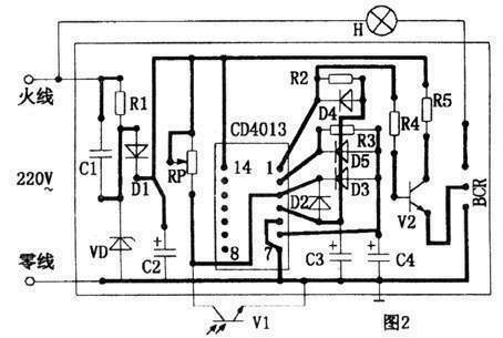 图2是该电路印制线路板。除V1、H外,全部元件装焊在印制板上。焊接时,要使用电烙铁有良好接地,以免损坏CD4013电路。调节R2、R3阻值,使IC振荡周期为0.5秒,即1秒钟发出2个振荡脉冲。调试时要注意印板上有市有火线,防止触电。调节RP,可调节V1灵敏度.