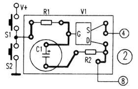 | 选择分类:当前分类——小说笑话 相关联或者相类似的文章: 23年前,有个年轻的女子~~~~(2191) MY8848网站销声匿迹 消费者(1196) 有地下王国吗?(1182) 七仙女离婚(1127) 电容器的参数与分类(1126) TL431特性及应用(1074) 地球的黑洞-百幕大三角区(1069) 录取通知书迟一年 家长和学校各执(1018) 三途河之鬼——人类真任性(1014) 白女孩(997) 优胜劣汰的用人原则(989) 何为天堂(987) 知识能否改变命运?(978) 求△V特性镍氢电池充电单元电路图(974) 深圳美的惊世绝仑(967) 做一个可爱的人(958) 无聊的笑话~~!!!(945) 三极管的开关作用(924) 简易FM无线话筒!装好的成品板(921) 考考你的眼睛——请找出那个轮子在(920) 首页 前页 后页 尾页 本站推荐: | 自作电子音量控制 大家都知道场效应管可用作电子音量控制,但所用型号的管子不易找到。在此笔者介绍一个简单的方法,只要有一个电容式驻极话筒即可实现。 制作时,首先拆开驻极话筒,里面有一个结型场效应管、一片振动模和一块带孔的金属极板等附件,场效应管的引脚极性及控制电路见图1。以CXA1191M(CXA1019)芯片收音机为例,IC的第④脚是电子音量控制端,该端电压越高音量越小,电压越低音量越大。当接下S1时,V+通过R1、R2、⑧脚端向C1充电(实测⑧脚对于V+而言为负极,对地而言为负极,对地而言为正极)。 由于电容的贮电作用,V1的G极电压随C1的充电而缓慢上升,S、D间电阻减小,使得④端电压下降,因此音量输出增大;按S2时,C1所贮的电能经过R2、R1、S1向地放电,V1的G极电压下降,S、D间电阻增大,④端电压因此升高,输出音量减小;点按S1、S2可得到你所需的音量。电源来自收音机机内电源。 ![]() 值得注意的是:原机W1必须拨至音量最大处,或者将W1拆除。C1为电解电容,有条件者可使用钽电解。 该制作的电路图和印板图见下。 ![]() 1、 本站不保证以上观点正确,就算是本站原创作品,本站也不保证内容正确。 2、如果您拥有本文版权,并且不想在本站转载,请书面通知本站立即删除并且向您公开道歉! |