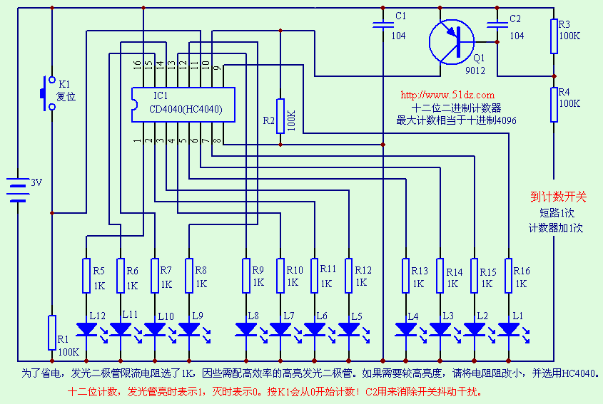 | 选择分类:当前分类——电子入门 相关联或者相类似的文章: 免费抄版软件——文字或图片转PCB文件(31341) 节能灯套件制作说明(9999) USB充电器套件制作说明(3141) 交、直流电大揭秘---通俗理解法(2597) 常用集成电路功能列表(2086) 电子基础知识--电阻篇(1748) 什么是压敏电阻?(1644) 什么是电平?(1644) 什么是“压敏电阻”(1644) [原创]最新智能色环电阻识别程序(1517) 整流电路详解 (1381) 本站免费资料的网址(1329) 爱好捕鱼的朋友千万别错过!(我的电鱼机制作经历)(1322) 测电阻法(1279) 电子基础知识--电感(1239) 充满电磁波的天空 (1194) 识别色环电阻的阻值...(1141) 了解隔离变压器(1116) 电烙铁的妙用(1109) 麻烦的USB硬盘和延长线(电子知识)(1105) 首页 前页 后页 尾页 本站推荐: | 二进制数的计数器 懂二进制数的人可以读出相当于十进制数的具体数字。这是学习电子技术动手的一个好制作,可以加深对二进制计数的理解。电路原理图 ![]() 采用CD4040IC带动12支超亮发光二极管,发光二极管的亮灭代表着不同的数字。 二进制其实很简单,是每满二就向前进一位,只要你做了这个实验,你就能很快的掌握二进制的有关知识。 相信不久你就能很快的明白1000=8、100=4、10=2是怎么一回事了。 ![]() 1、 本站不保证以上观点正确,就算是本站原创作品,本站也不保证内容正确。 2、如果您拥有本文版权,并且不想在本站转载,请书面通知本站立即删除并且向您公开道歉! |
