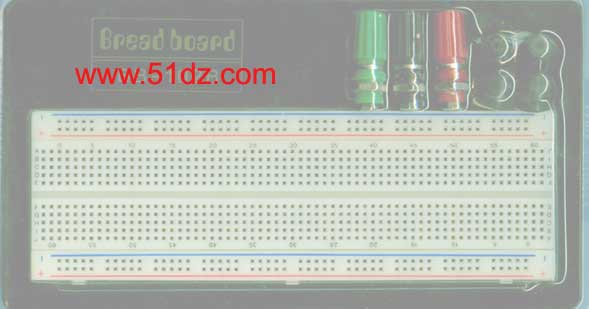 面包板是实验室中用于搭试电路的重要工具,熟练掌握面包板的使用方法是提高实验效率,减少实验故障出现机会的基础之一。在具体使用的时候,通常是两窄一宽同时使用,两个窄条的第一行一般和地线连接,第二行和电源相连。由于集成块电源一般在上面,接地在下面,如此布局有助于将集成块的电源脚和上面第二行窄条相连,接地脚和下面窄条的第一行相连,减少连线长度和跨接线的数量。中间宽条用于连接电路,由于凹槽上下是不连通的,所以集成块一般跨插在凹槽上。