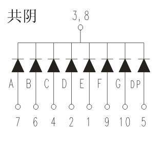 数码管分为共阳型和共阴型,共阳极型就是发光管的正极都连在一起 ,作为一条引线,负极分开。本数码管就是超高亮共阳八段数码管:八段数码发光管就是8个发光二极管组成的,在空间排列成为8字型带个小数点,只要将电压加在阳极和阴极之间相应的笔画就会发光。8个发光二极管的阳极并接在一起,8个阴极分开,因此称为共阳八段数码管。