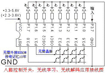 本集成电路WY20D8是本站最新推出的一块用于开关控制的专用集成电路芯片。WY20D8除了具备8路开关手动控制功能,还有无线学习遥控器编码和遥控器无线控制开关的功能,学习到的编码被记忆在本芯片中,可以保证停电十年不丢失记忆的数据。完成这全部的功能,不需要外接晶振,不需要外接复位电路,不需要外接24C01存储器,全部功能一个芯片完成!请参见应用接线图的下部分。以下是功能描述: