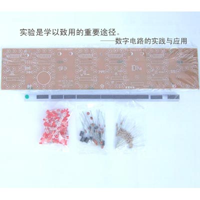 本电子钟为纯硬件电路,非常适合数字电路实践制作,是各学校、院校的电子实习首先套件!本电子钟走时由石英晶振决定,走时精度高,主要元件有11个集成电路、130个高亮发光二极管和53个电阻及其它所有元件用胶袋包成一包,配上330MM*70MM大尺寸的电路板,欢迎各位电子爱好者一起动手制作。 套件内含有电路原理图等装配资料,电路板上也是元件装配图,还送有部分备用元件,适合学生、电子初学者、成人等学习、娱乐、装配用途。