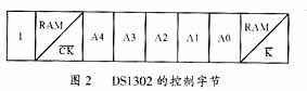1.2 DS1302的控制字节 DS1302 的控制字如图2所示。控制字节的最高有效位(位7)必须是逻辑1,如果它为0,则不能把数据写入DS1302中,位6如果为0,则表示存取日历时钟数据,为1表示存取RAM数据;位5至位1指示操作单元的地址;最低有效位(位0)如为0表示要进行写操作,为1表示进行读操作,控制字节总是从最低位开始输出。