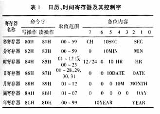 1.3 数据输入输出(I/O) 在控制指令字输入后的下一个SCLK时钟的上升沿时,数据被写入DS1302,数据输入从低位即位0开始。同样,在紧跟8位的控制指令字后的下一个SCLK脉冲的下降沿读出DS1302的数据,读出数据时从低位0位到高位7。 1.4 DS1302的寄存器 DS1302有12个寄存器,其中有7个寄存器与日历、时钟相关,存放的数据位为BCD码形式,其日历、时间寄存器及其控制字见表1。