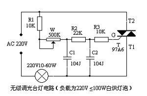 本调光电路采用交流220V供电,可控硅会在每个电压交变(正悬波的0电位)时自动关断。平时由于R1、W、C1、R2、C2、R3的移相延时作用,会使触发电流来得比较迟, 这是因为电压通过电阻给电容充电,电容两端的电压相位会滞后产生延时,当W的阻值调至最小时,R1和C1组成第一级延时,R2和C2组成第二级延时,但是,由于R1、R2的阻值很小,当A端电压上升时,T1的控制极仍能很快产生触发电流导通,让负载有电流通过;但是,当W的阻值调节到最大时,C1、C2上的电压上升很慢,T1甚至在正半周结束了还没有导通,这样负载就没有电流通过。通过调节W的阻值,可以调节可控硅在每个交流电半周期的导通时间的长短,从而达到调节负载消耗功率来起到调光的作用。