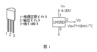 在动手之前,你必需准备一块数字式万用表或数字电压表。如果没有,你可参照这里自制一个数字电压表。如果你只有指针试的万用表,也没关系,只要有一个1V电压档,也可用来制作温度计,只是此时的温度显示为指针式。前面我们提到的只有一个元件的温度计,这个元件就是我们要介绍的集成温度传感器LM35D。它是把测温传感器与放大电路做在一个硅片上,形成一个集成温度传感器(见图1)。