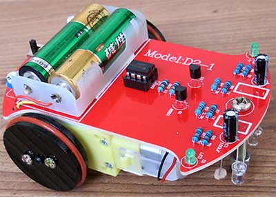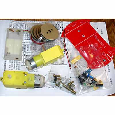 数字电路智能循迹小车套件,在整个组装过程中我们不但能熟悉机械结构组装,还能学习到:光电传感器、电压比较器、电机驱动电路等相关电子知识。 学生通过动手实践能大大提高解决实际问题的能力,而且智能小车还是一个很好的硬件平台,只要增加一些控制电路就能完成循迹小车、救火机器人、足球机器人、避障机器人、遥控汽车等课题。。 在白色的场地上有一条16毫米宽的黑色跑道,我们的循迹小车能沿着黑色跑道自动行驶,不管是跑道如何弯曲小车都能自动行驶真是太神奇了!大家知道当光源射到白色物体和黑色物体上时的反光率是不同的,我们这里用红色的LED作为光源,光线通过地面反射到光敏电阻上通过检测光敏电阻阻值变化能判断小车是否行驶在白色区域上,如果检测到是黑色跑道,说明小车跑偏,这一侧的电机就会减速甚至停转这一侧的绿色的LED熄灭,驱动小车向相反方向行驶,这样小车就能始终沿着跑道行驶了。