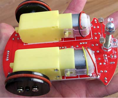 此电路应用到主要元器件: 1、LM393比较器集成电路 : LM393是双路电压比较器集成电路,由两个独立的精密电压比较器构成。它的作用是比较两个输入电压,根据两路输入电压的高低改变输出电压的高低。输出有两种状态:接近开路或者下拉接近低电平,LM393采用集电极开路输出,所以必须加上拉电阻才能输出高电平。 2、带减速齿轮的直流电机 : 直流电机驱动小车的话必须要减速,否则转速过高的话小车跑得太快根本也来不及控制,而且未经减速的话转矩太小甚至跑不起来,我们专门定做的这种电机已经集成了减速齿轮大大降低了制作难度非常适合我们使用。