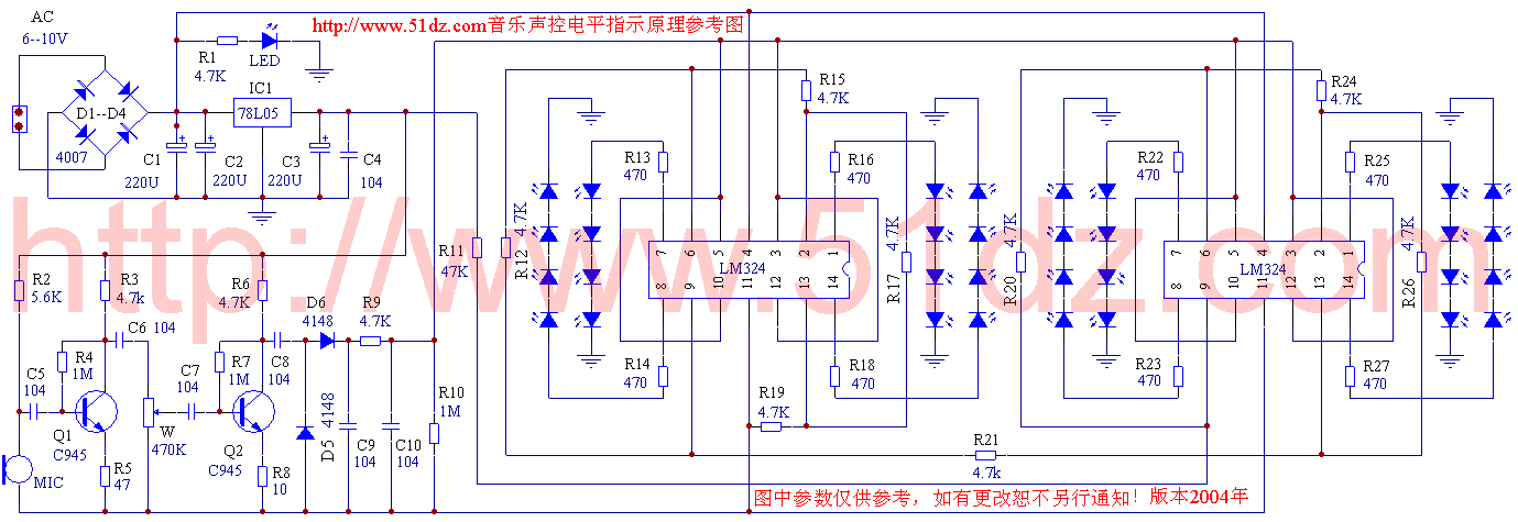 音乐声控电平指示灯套件:随着音乐的声音的大小两边的发光二极管会随着闪动。电路板上有标元件参数,电路原理图请点击/p/09/d/mu2004.gif 电路板的规格:长320mmx宽30mm。本站配的IED灯都是红色的,大家可以根据自己的爱好,配不同颜色的灯,闪出的效果将会不一样。其它颜色的灯本站有单独销售。