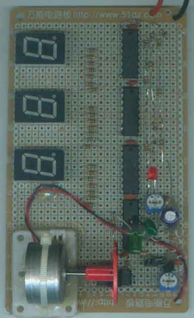 因此,整个过程: …… → 用几毫秒计数复位(显示上次的数) → 长达1秒的计数(显示上次的数)→ 周期到了用几毫秒读取本次计数并锁存 → 用几毫秒计数器复位(显示上次的数)→ ……,如此周而复始,这样我就可以看到延时一个周期的电动机的实时转速。我们将同期调节到1秒零几个毫秒,这样,我们测得的数据就每秒钟转多少圈。如果我们将CD40110的锁存脚LE改接成低电平,将复位脚RST接一个手工复位开关,就成了一个常用的电子计数器。