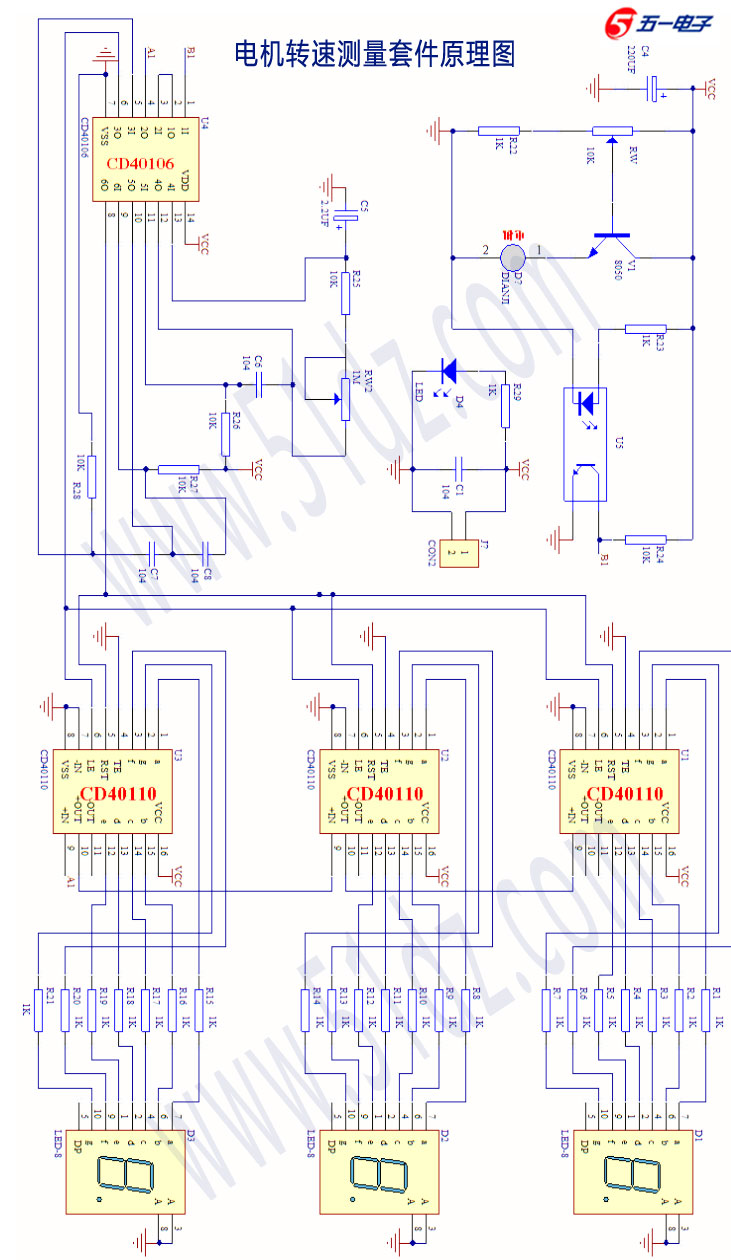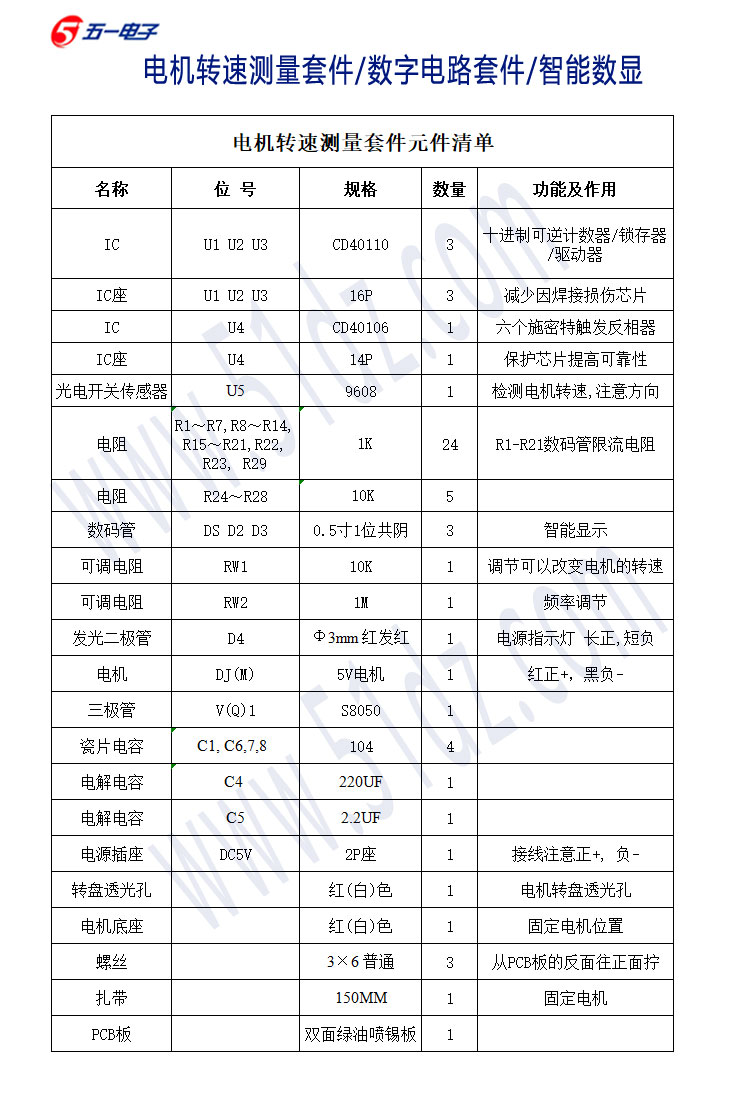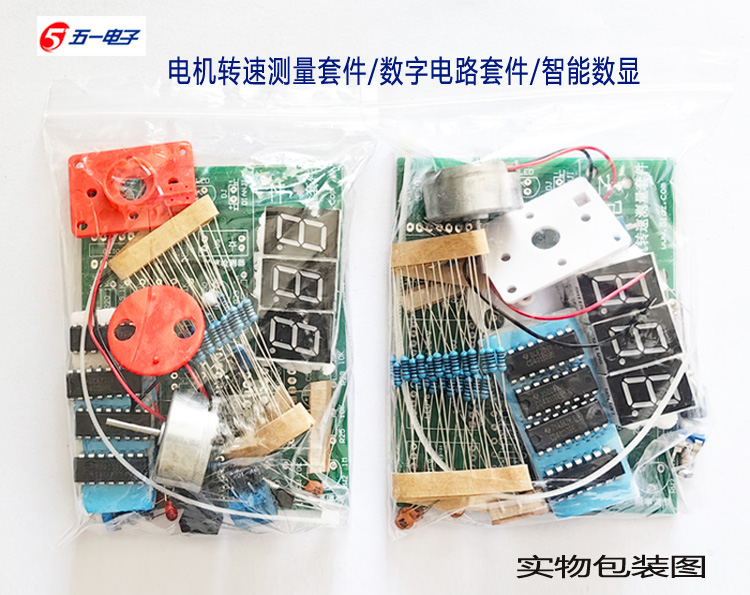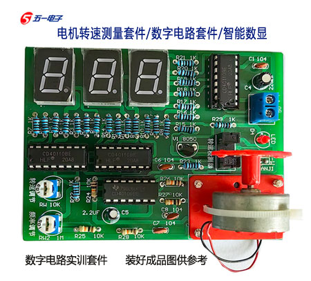 | 电机转速测量套件:现配有元件清单、原理图、双面玻纤PCB印刷电路板、所有元件和制作说明。本套件一般安装无误都是会一次性成功,全部配有IC插座,如果是IC有问题的话,方便更换使用。本站配的IC都批量试过才发货的,大家放心使用。本套件以数字电路为核心,通过光电开关传感器检测电机转动产生速度电信号,用数字电路进行计数,并采用数码管显示电机速度。