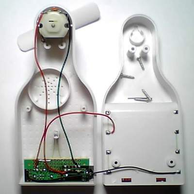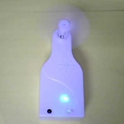 本套件组装好后,就是一个微型小风扇,采用2节5号供电,具有强风、弱风两档调速,同时,七彩变色二极管在风扇肚子里面发光(大家可以自己开孔装到外面来),在晚上时,光线使会将壳体映亮,或者看到点点光亮,令人联相篇篇。