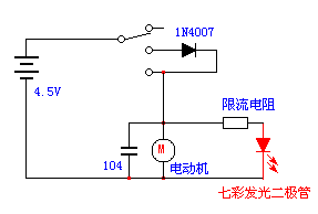 这是电路原理图,这是用本站的免费在线画图画的,其中104电容一定并联在电动机的两个引出接线上,该电容直接是焊在电动机上面的,距离远了效果不好!大家可以试验,如果不装这个电容,7彩发光二极管是不会变色闪亮的!为什么呢?因为七彩发光二极管内部有一个小单片机芯片来控制红色、绿色、兰色发光的,干扰太大了,单片机不停的复位,灯自然就不能闪动了。