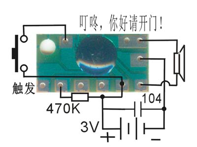 叮咚,你好请开门!触发,规格:长24mm,宽11.2mm欢迎各位电子爱好者邮购、选购。只需花小小钱就可帮你的弟弟妹妹制作一个理想的玩具,同是也可以配合电子实验套件使用,品种很多。芯片里固化了一种语音,叮咚,你好,请开门!触发一下,响一次。本站配套的电阻、喇叭、电池盒、导线都有,找不到也搜索关键字,搜索商品名就会跳出来。如果声音频率有点快的话,可以将电阻加大,这样可以使听到的声音更清楚。