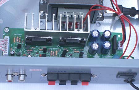 电路工作原理: 双16.5V的交流电AC-IN插座输入,由整流模块PBS156G整流和四个1000U的电容滤波后给整机供电。 Q6、Q7和旁边的阻容元件组成音乐指示灯功能,左右声道的信号分别从R61和R62输入。当有音乐信号的时候,经C31送入Q7的基极进行放大,后经C32送给D3、D2倍压整流,后经R55加在Q6的基极,使其正偏压导通,接在Q6集电极上的LED1、LED2发光。当没有音乐信号的时候,Q6失去正偏压而截止,LED1、LED2熄灭。 功放前级由运放JRC4558担任,信号从功放部分电路板上的莲花插座输入,经8PIN的排线连接到音调板,经R44、R45进入转换开关K1(注:本板中没有使用收音功能,所以没有配其相关元件K1、R40、R41、RED、CN6、CN5。其中K1为音源转换开关,要注意在标注的那组接脚接上跳线,否则没有信号送往后级)经VR4声道平衡调节后分别从C21、C22送往音调电路。本板使用的是衰减式音调控制,VR1为高音调节电位器,VR2为低音调节电位器,音调衰减后的信号分别从IC JRC4558的2脚和6脚输入进行缓冲放大,分别从1脚和7脚输出。一路经R61、R62去控制音乐指示灯,一路经VOL电位器进行主音量调节,后又经8PIN的排线送往功放板进行功率放大。