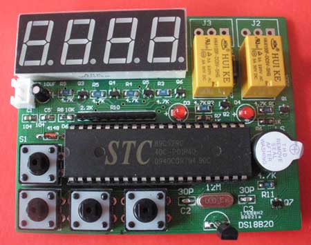 可预置温度超限报警控制套件:可预置温度上限和下限报警的控制器套件(贴片元件设计) 检测的环境温度是通过一线温度传感器 DS18B20 采集,然后通过单片机芯片STC89C52处理并在数码管上显示,同时单片机控制两个 5V 继电器,用于对温度进行实时控制操作,当温度上升到达某一定值,开一继电器(继电器常开端接有降温电器);当温度下降到某一定值,开另一继电器。同时有蜂鸣器报警提示。温度的上下限可自行设定。能手动设置上下限温度,更加智能化。