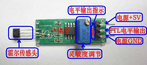 简要说明: 一、 尺寸:32mm X11mm X 20mm 长X宽X高 二、 主要芯片:LM393、霍尔开关3144 三、 工作电压:直流4~6伏 四、 特点:1、具有信号输出指示。 2、单路信号输出。 3、输出有效信号为低电平。 4、有磁场切割就有信号输出 5、可用于电机测速/位置检测等场合